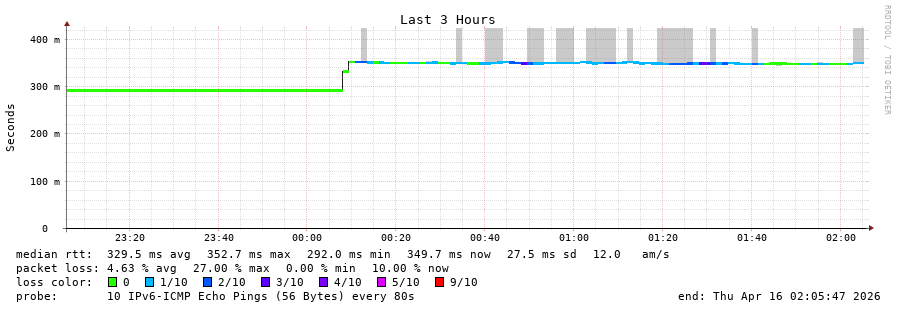 traceroute to 2402:1f00:8400::2:0:19c (2402:1f00:8400::2:0:19c), 30 hops max, 80 byte packets - Generated at 2026-04-15 22:45:01