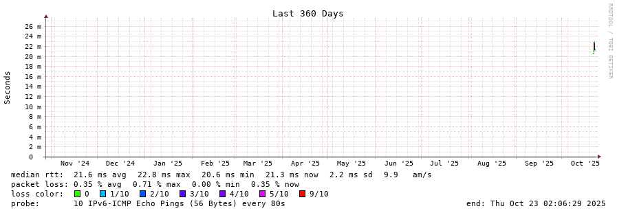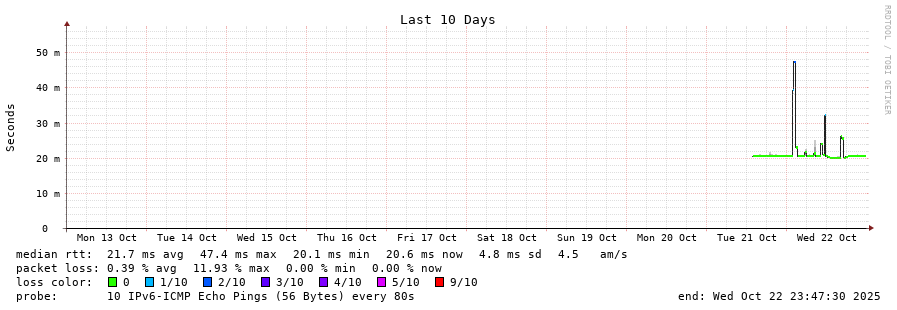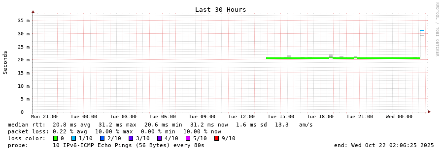 traceroute to 2a0c:9a40:8610:e3f::1 (2a0c:9a40:8610:e3f::1), 30 hops max, 80 byte packets - Generated at 2025-10-22 01:00:01