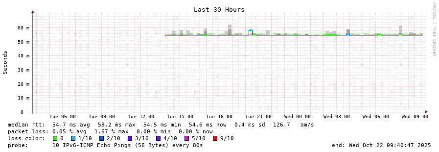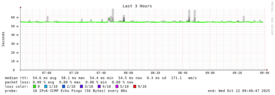 traceroute to 2001:67c:1e0:0:c225:e9ff:fea8:6a0a (2001:67c:1e0:0:c225:e9ff:fea8:6a0a), 30 hops max, 80 byte packets - Generated at 2025-10-22 07:30:01